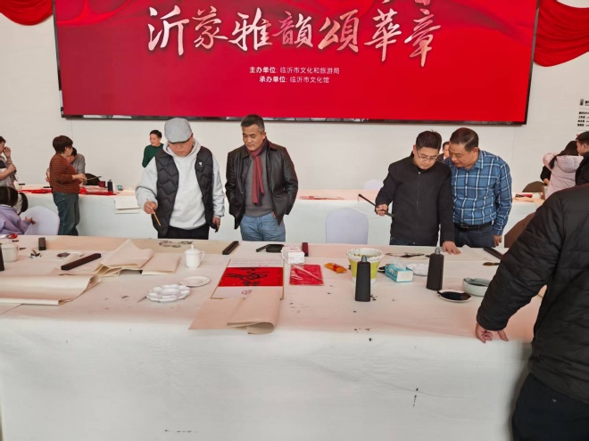 活动现场墨香四溢,喜气洋洋。书画家们挥毫泼墨,笔走龙蛇,以饱满的热情投入创作。书法作品或遒劲有力,或飘逸灵动;绘画作品题材丰富,风格多样。艺术家们各展所长,累计创作书画作品200余幅,生动诠释了沂蒙文化的深厚底蕴和新时代发展的蓬勃气象。